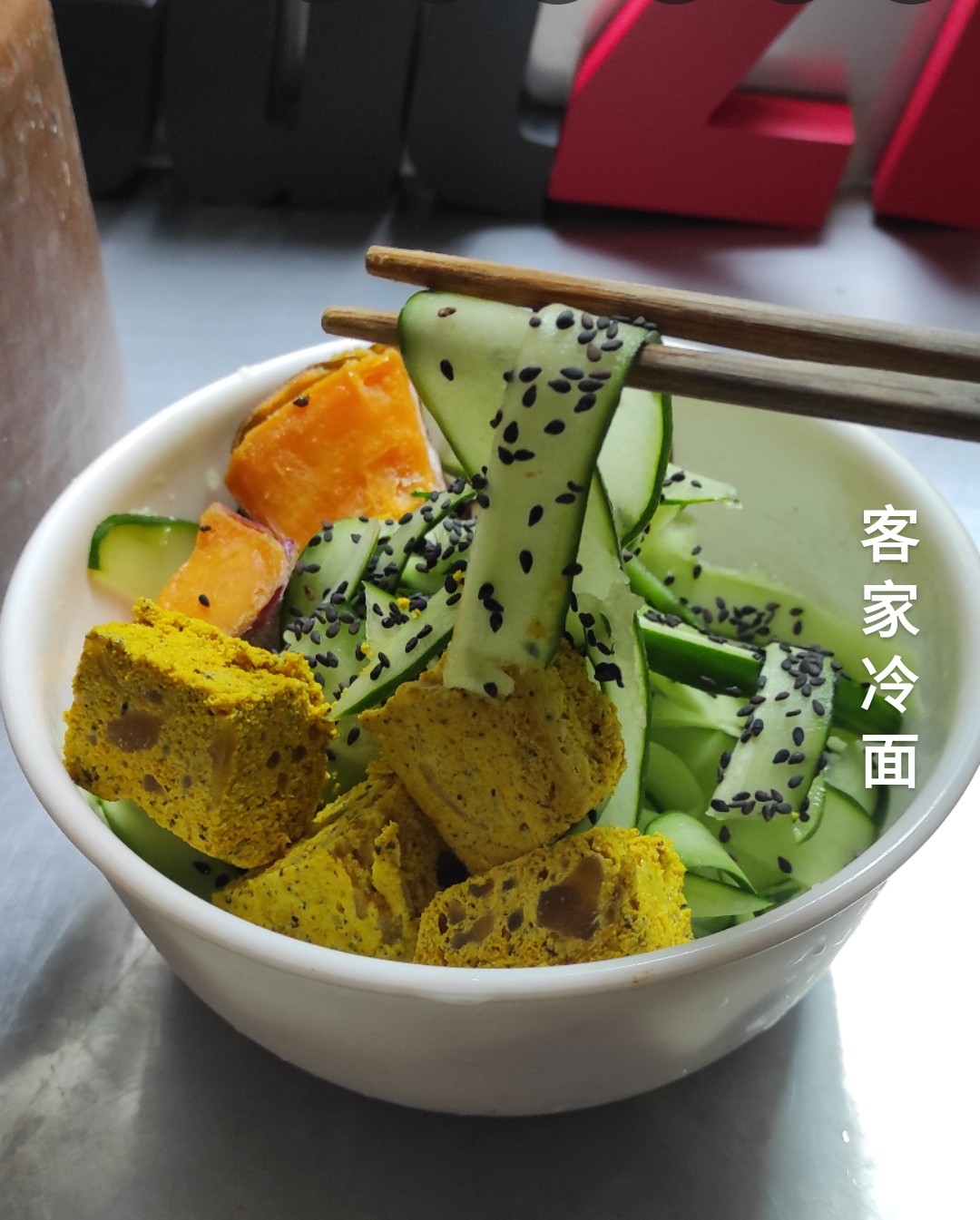 Cold Noodles 客家冷面. Oil free Full Fat. Superior DHA Omega 3. Protein. 100% handcrafted from scratch using Natural Unprocessed Ingredients: Cucudle (cucumber noodles) organic Kiyuri cucumber, organic sweet potato, toasted organic sesame seeds, 100g original Sacha Inchi Cheese Tofu 招牌客家豆腐.